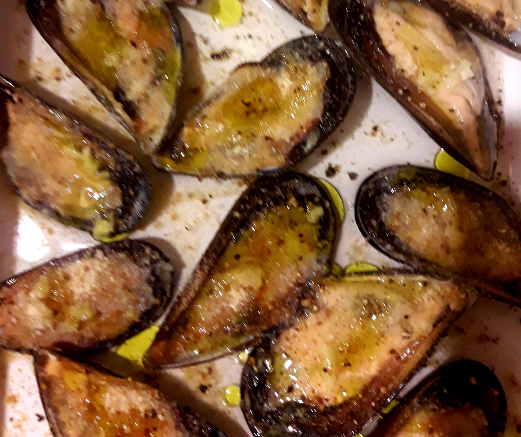 Place the mussels in an oven dish and squeeze lemon juice over each one. Crush the garlic and distribute it carefully over the mussels. Make sure you get some garlic in each shell. Sprinkle some breadcrumbs on top. Season with black pepper and a drizzle of oil. Bake in a pre-heated oven at 200°C for about 10 minutes until they’re golden and sizzling. Mop up the garlicky juices with plenty of crusty bread…delicious!