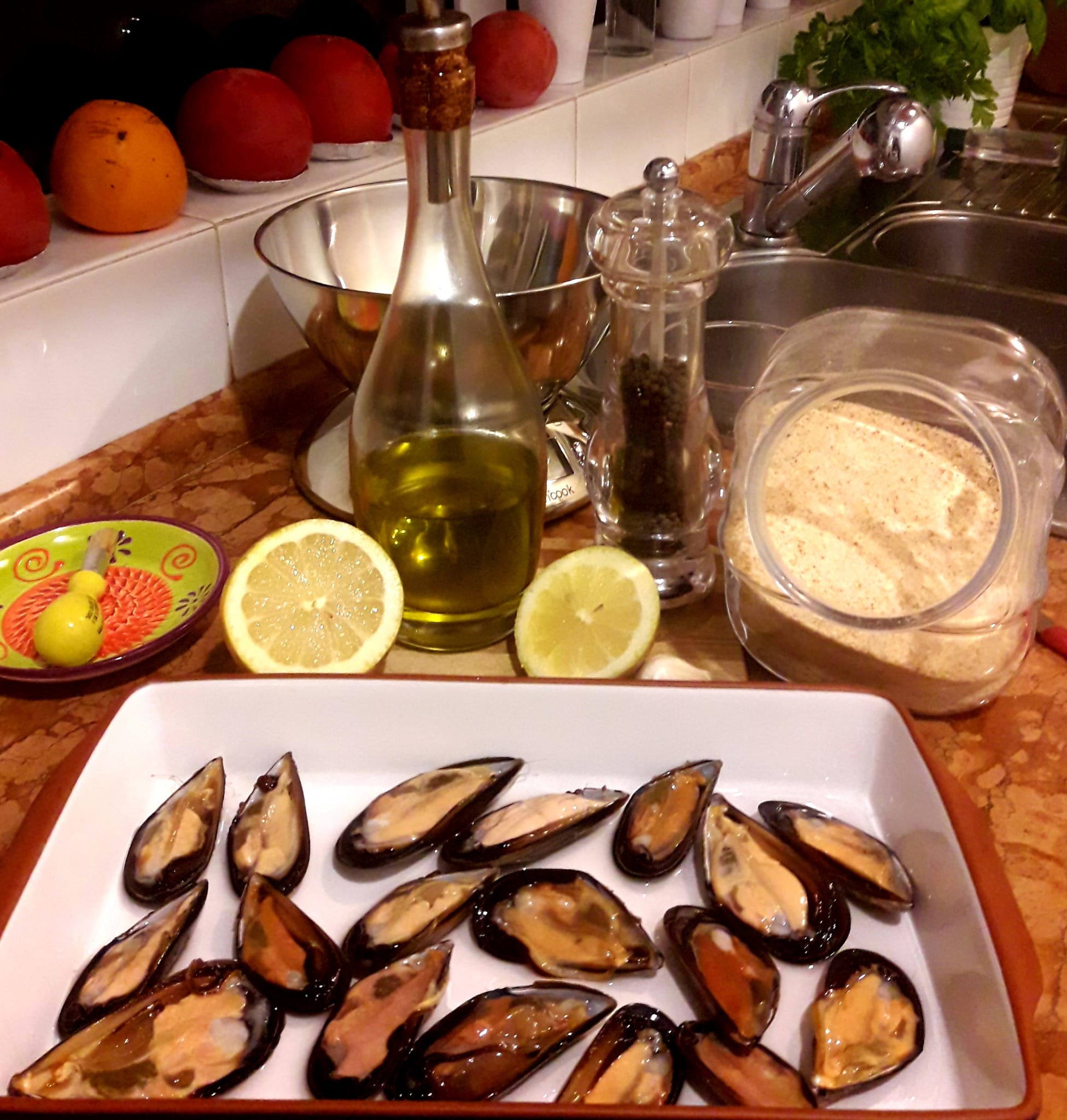 Mussels, fresh lemon, black pepper, breadcrumbs, extra virgin olive oil