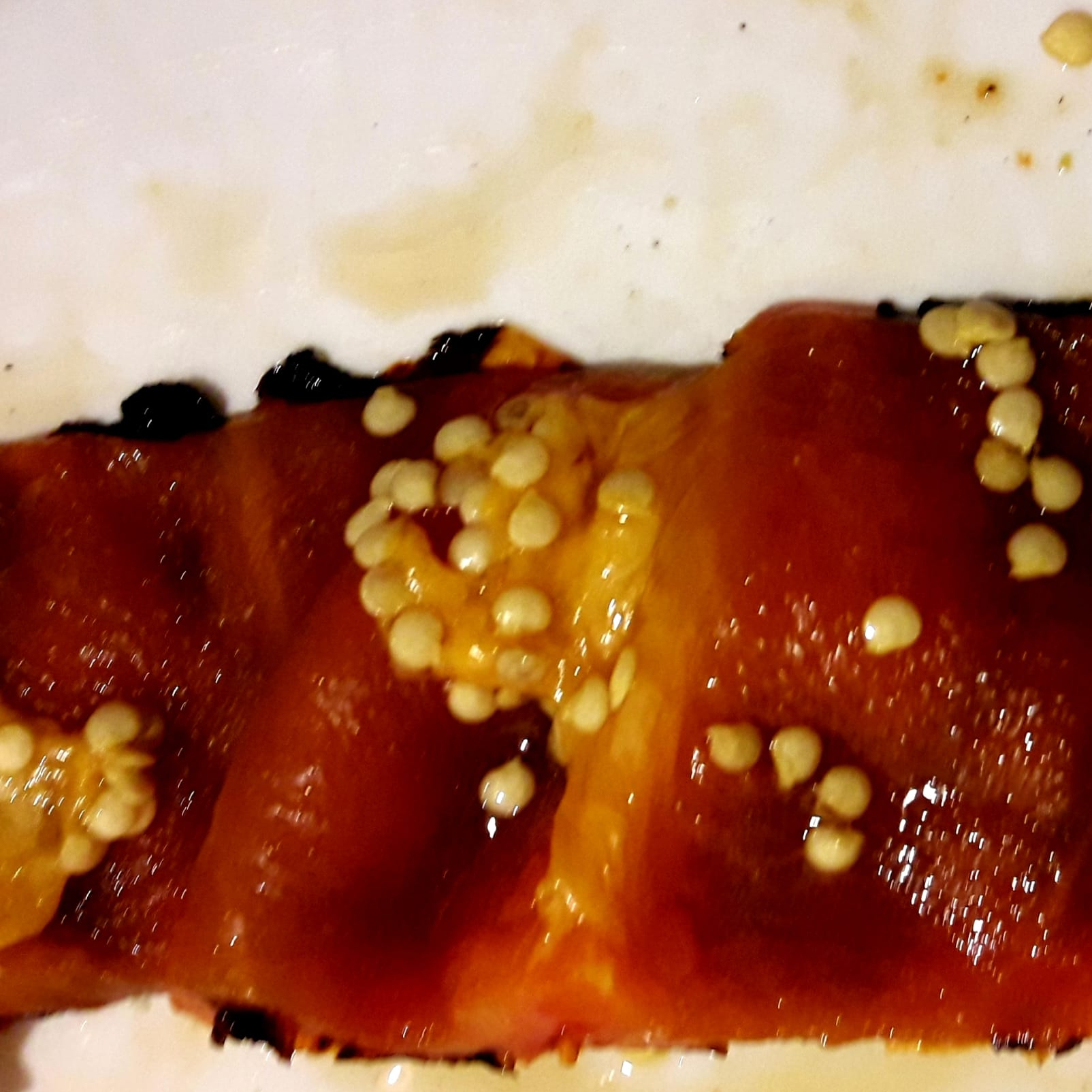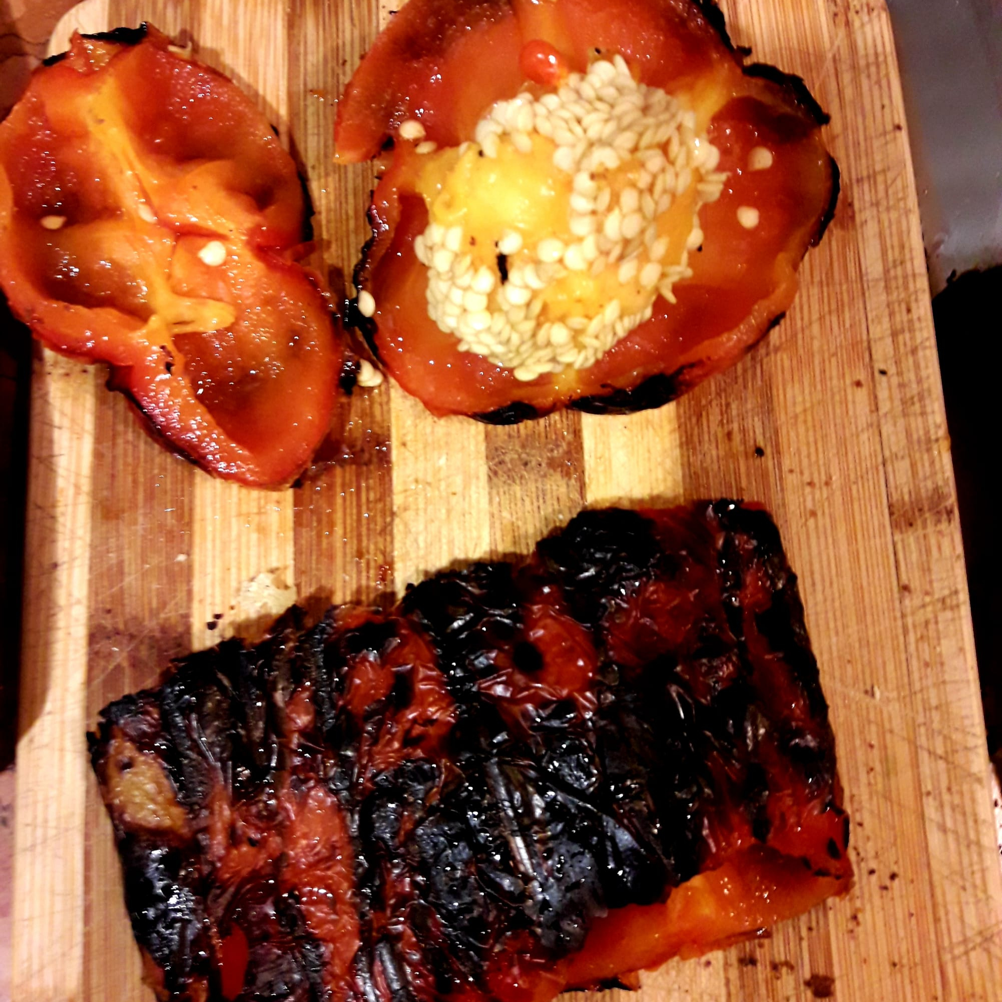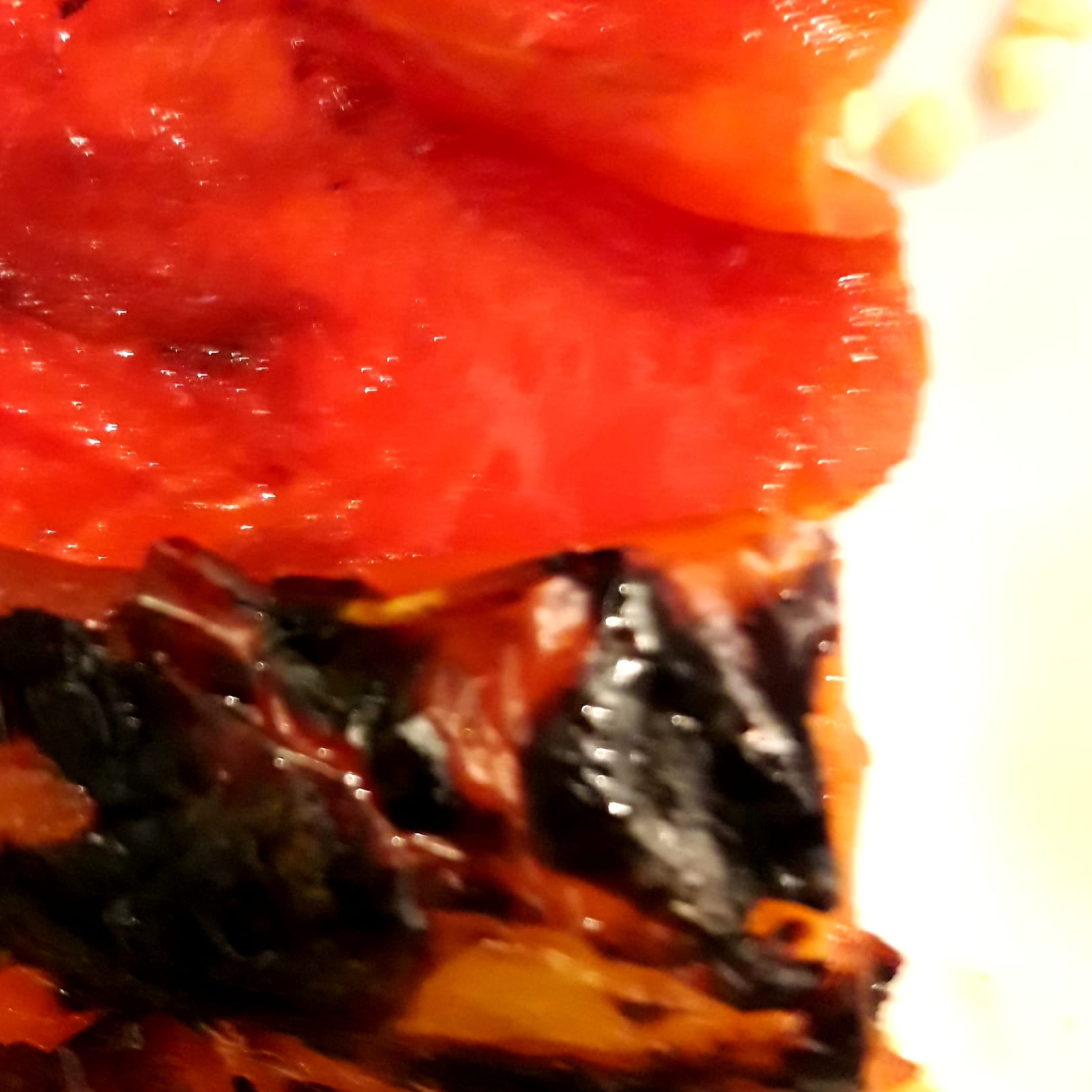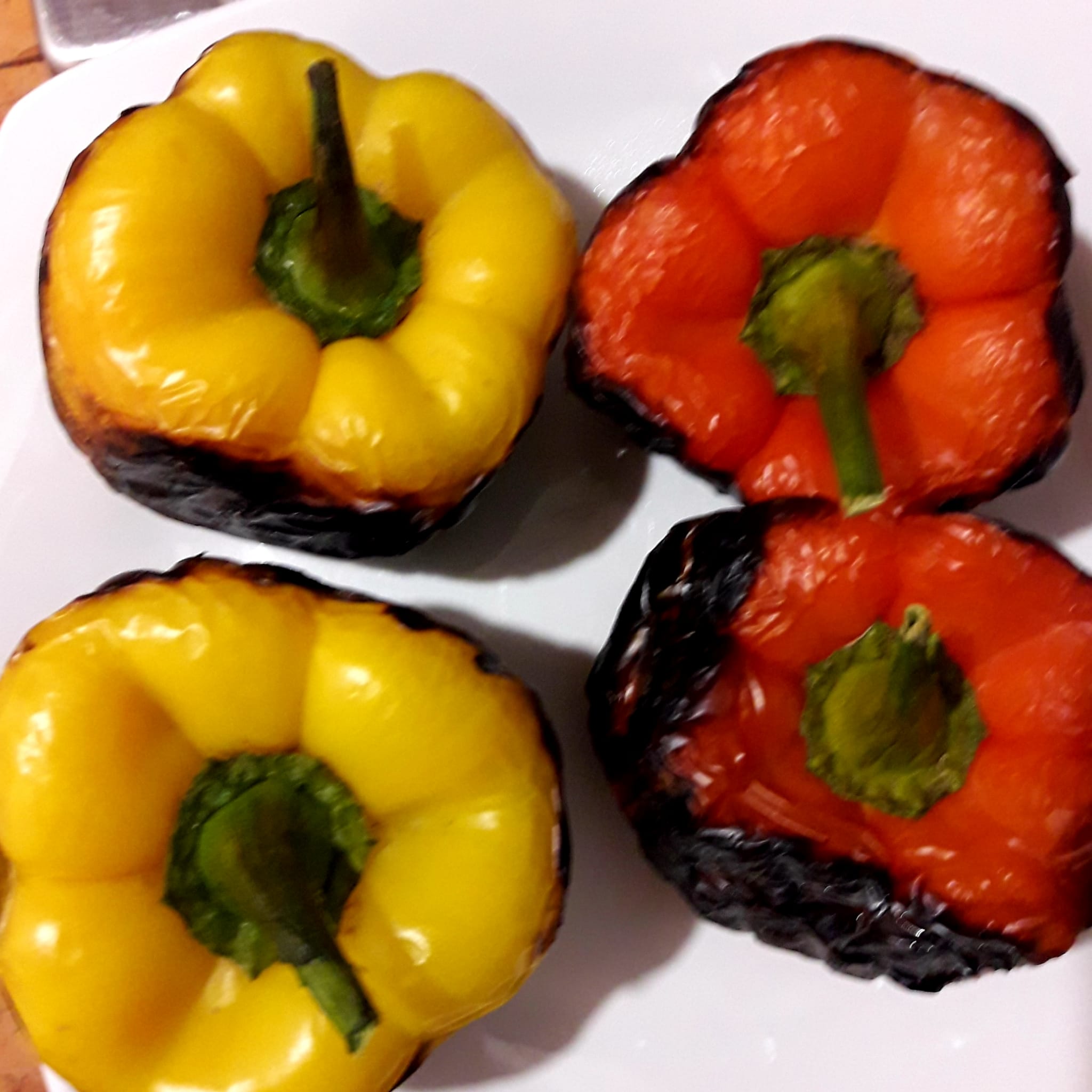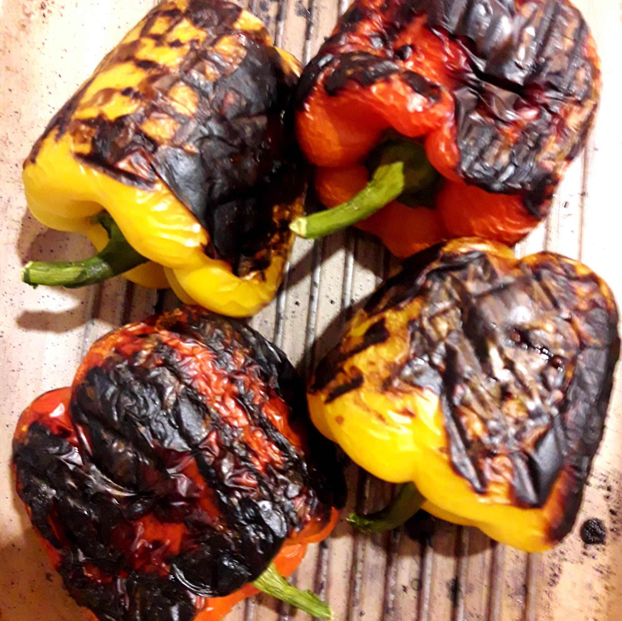 Cook the whole peppers on a griddle pan turning regularly until the skin blackens all over (see photo). When they’ve cooled enough to handle cut off the top, if any nice juice has collected inside pour it into a bowl before cutting off the bottom. Open the pepper and place it skin side down on a chopping board. Remove the seeds and any stringy bits you find inside. Turn it over and peel off the skin…it will come away very easily with your fingers. Then cut the peppers into strips and put into the bowl with the juice. Season with salt and pepper, add the halved garlic clove, capers and parsley. Stir everything around to mix and barely cover with olive oil. Serve with cheese and crusty bread to mop up the pepper flavoured oil. This will keep happily in the fridge for a couple of days in a covered container.