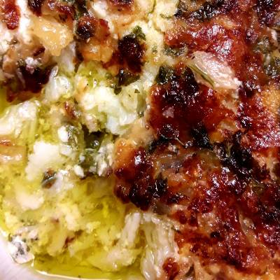 Gently fry the onion and when transparent and the washed , boned and chopped sardine (or anchovies) and cook for a couple of minutes. Now stir in the chopped parsley and add salt and pepper. Place the floured pieces of salt cod in a small oven dish 12x14cm and distribute onion and parsley mix on top. Sprinkle in grated cheese, pour in milk and oil. Push the fish down with a spatula…it should be covered by the liquid. Bake in centre of oven at 175°C for 1 hour 30 minutes. Serve with green vegetable (broccoli or spinach) or a green salad and lots of crusty bread.