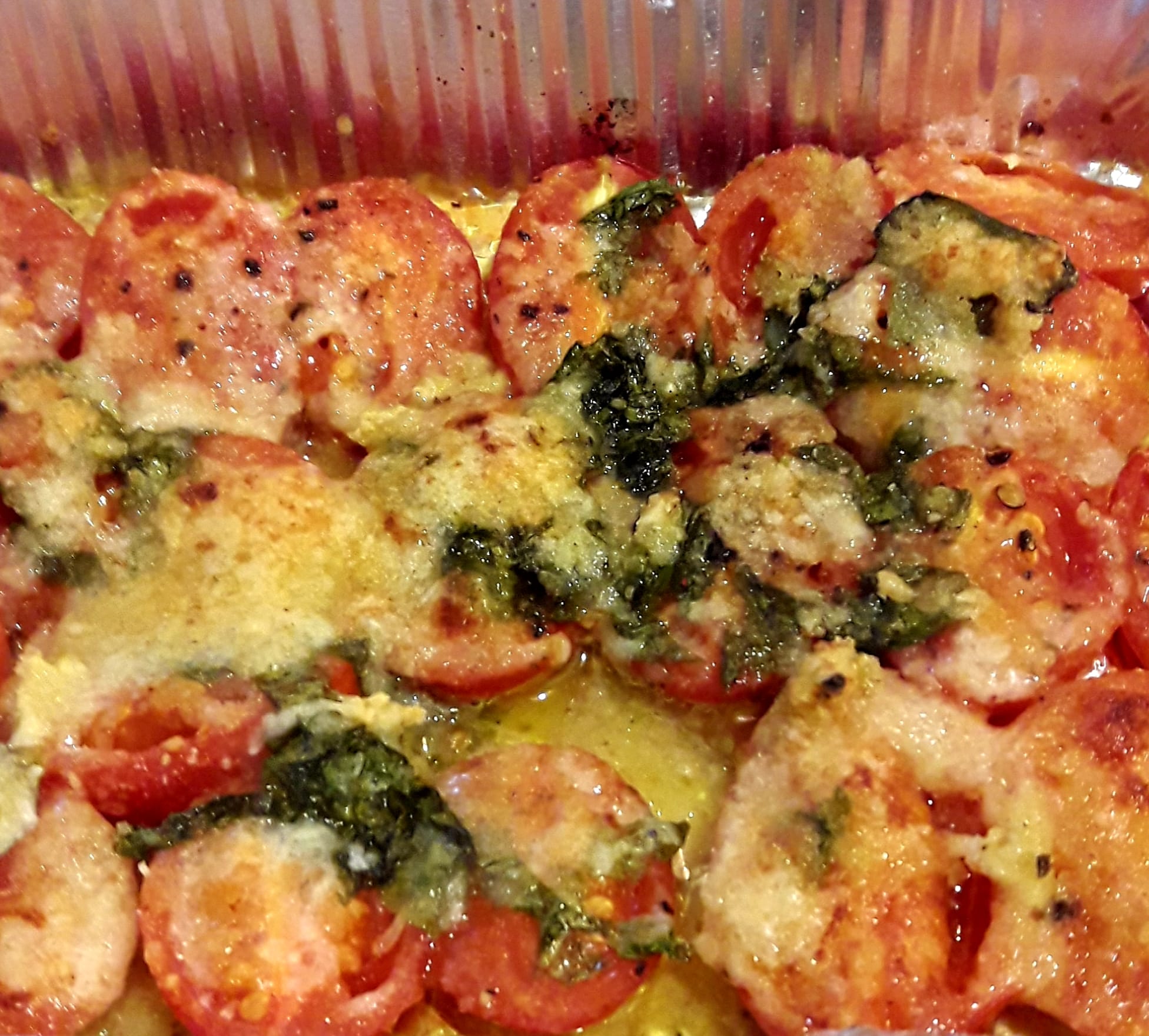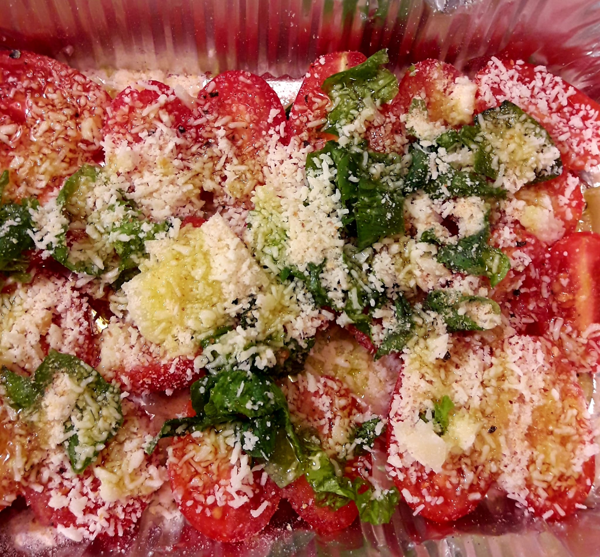 Cook the pasta according to the instructions on the packet. Halve the tomatoes and place them in a small roasting tin. Crush the garlic and shred the basil and distribute on top of the tomatoes (with the capers if you’re using them). Salt and pepper to taste. Sprinkle with the grated cheese and the breadcrumbs. Drizzle over some olive oil and bake for about 20 minutes at 200° Mix the the pasta and roasted tomatoes together, another sprinkling of cheese and a twist of black pepper. Buon appetito 🙂