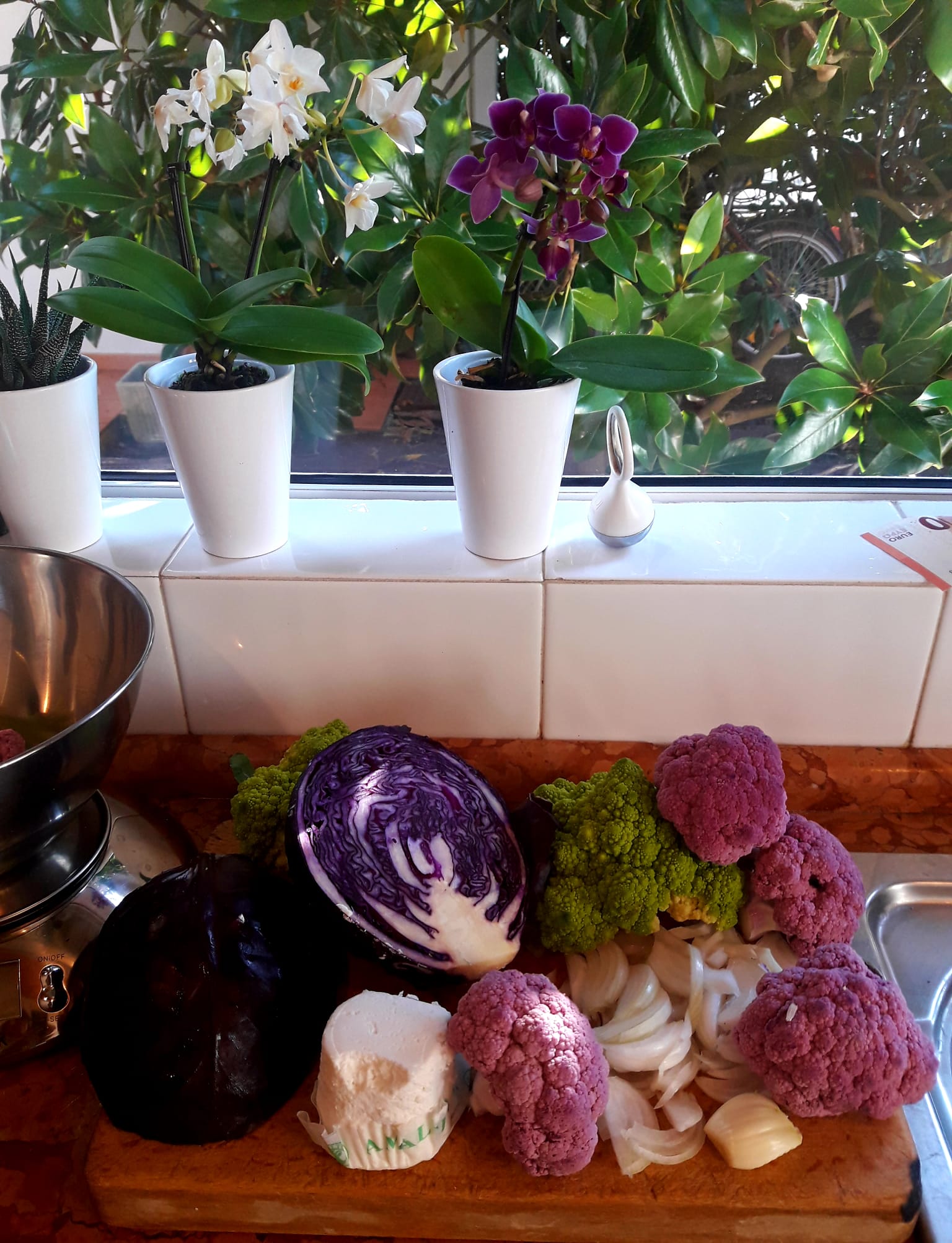 Sweat the onion, garlic, cauliflower and red cabbage in the oil until they wilt….about 15 minutes in a saucepan, on a low heat, with the lid on. Add salt and pepper to taste (remember if you’re using water rather than stock you’ll need to be more generous with the salt), and add the stock or water. Bring to the boil and simmer for about 30 minutes. Zap with an immersion mixer, adjust the seasoning and add a generous handful of grated cheese. Stir well and admire the wonderful colour.