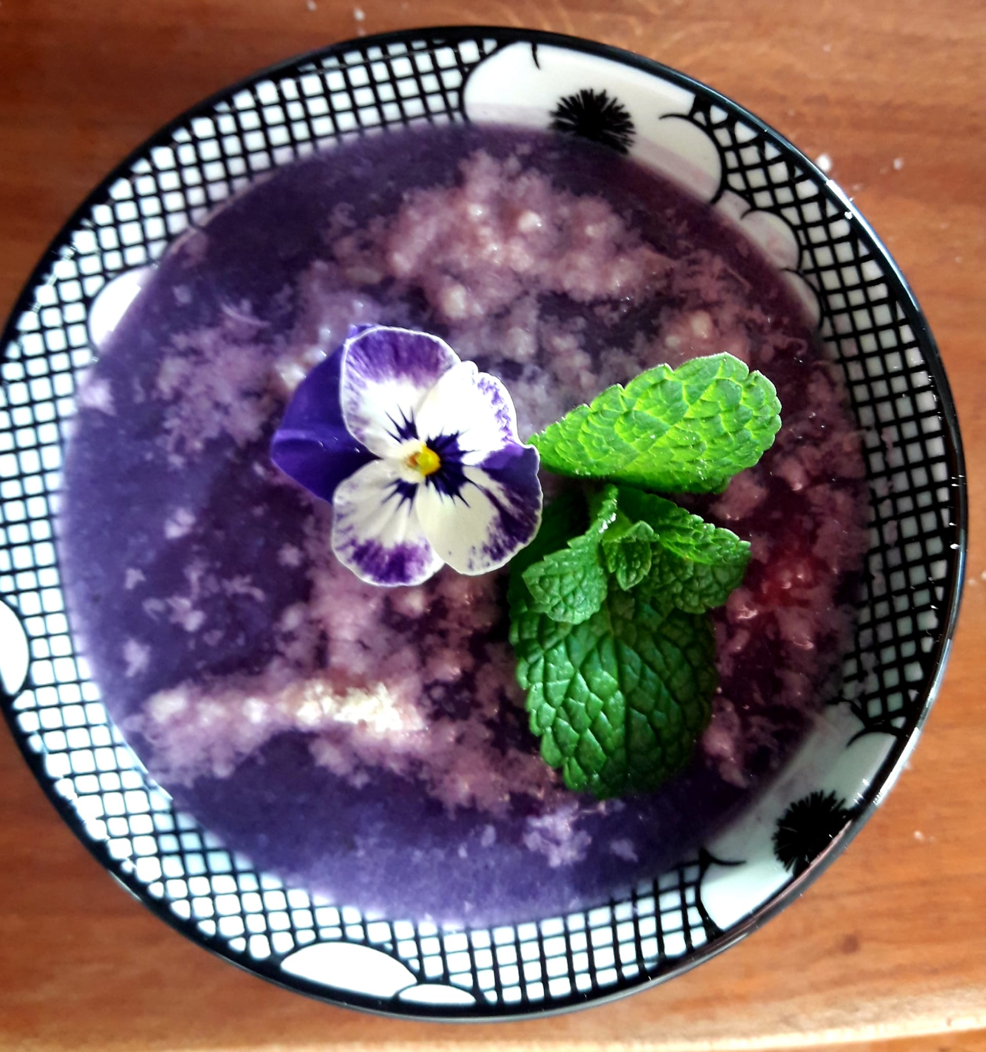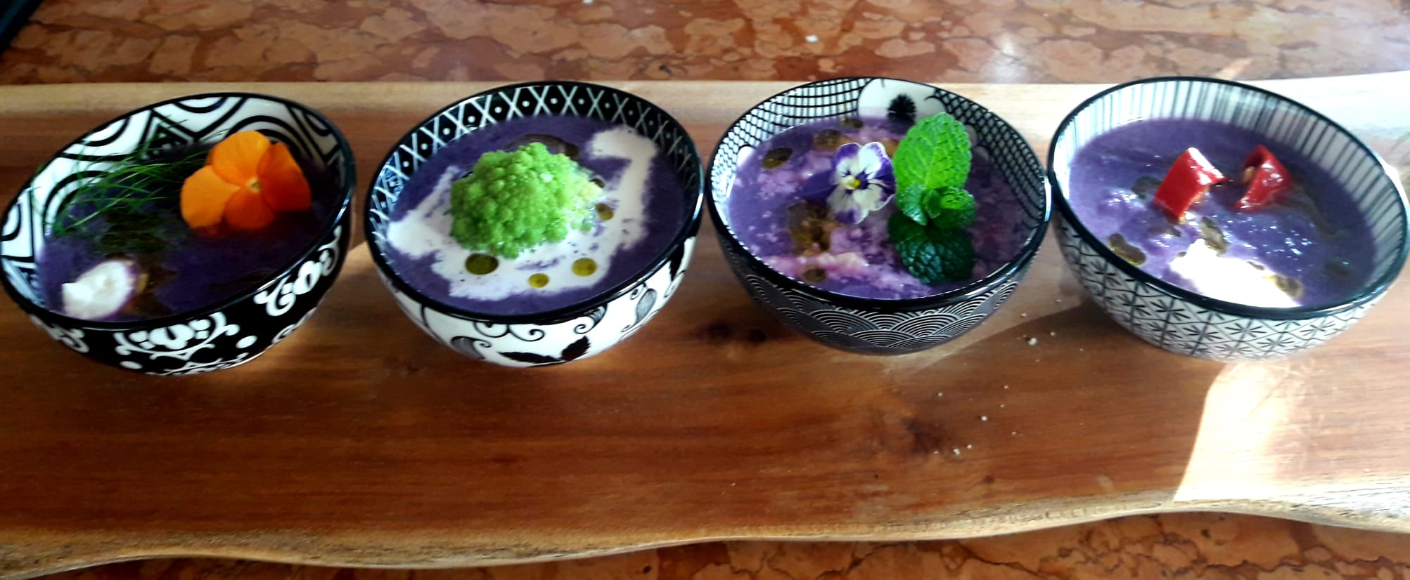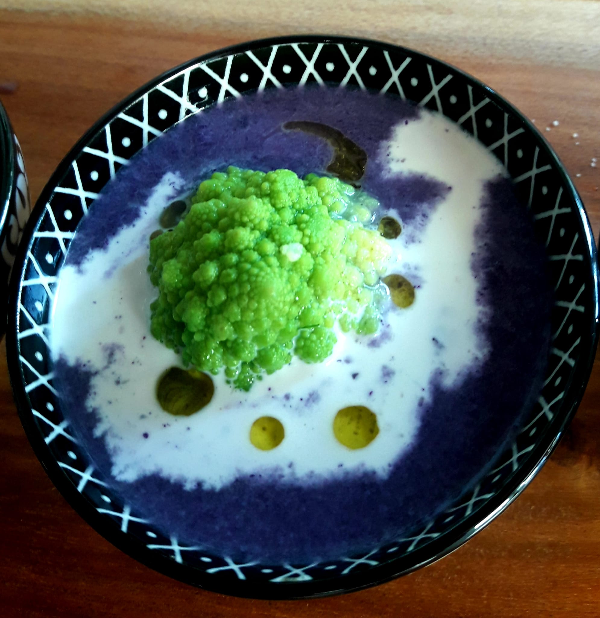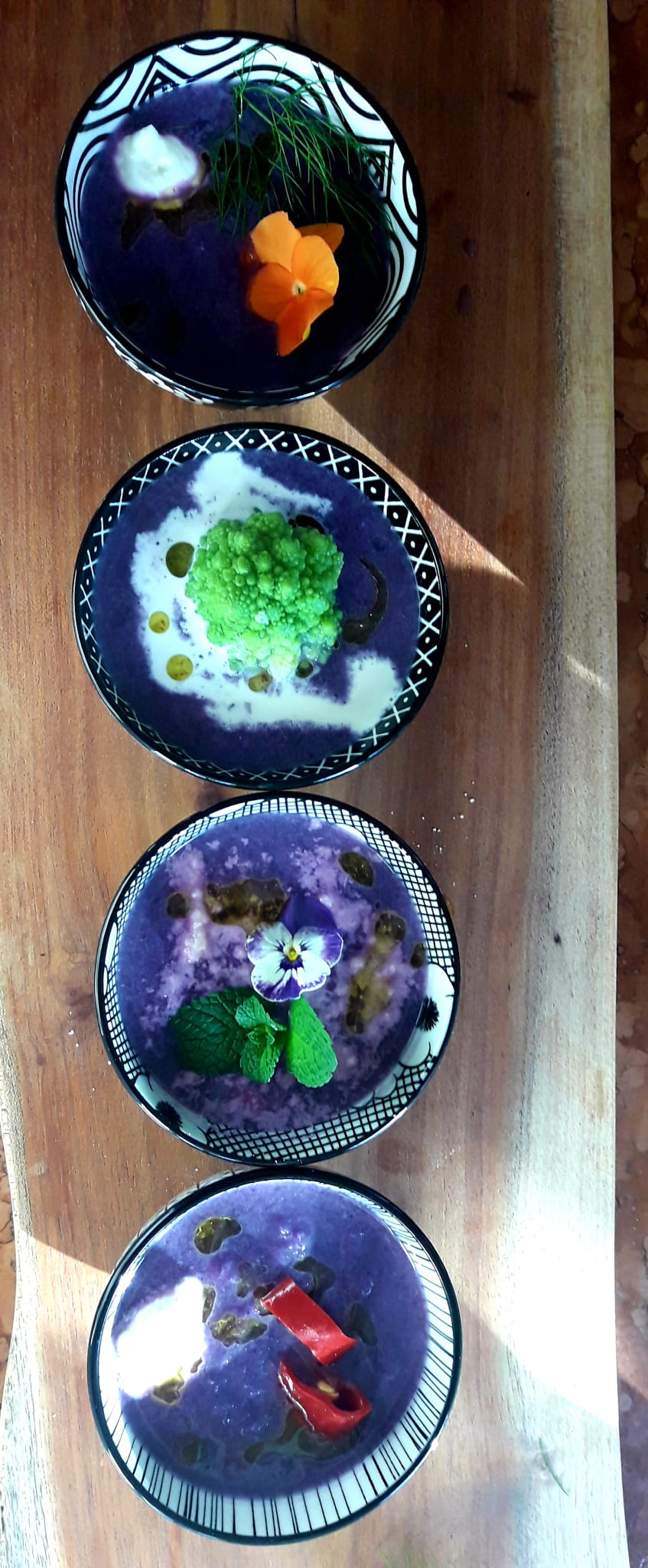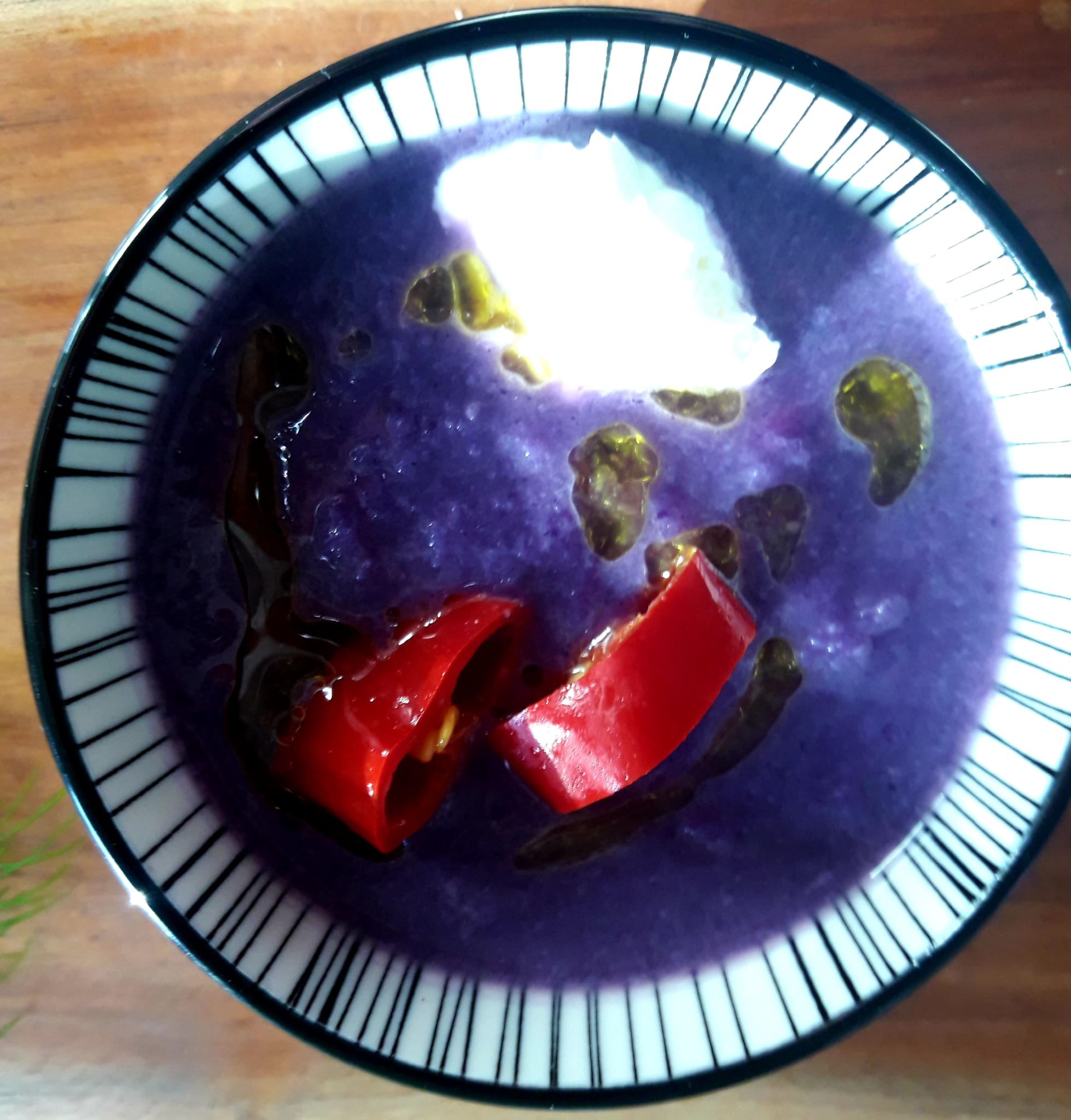 Now the fun starts! This deep purple soup is a canvas for your culinary imagination. You can serve it with some grated cheese, a swirl of fresh cream, a drizzle of oil and a sprig of parsley for everyday dining….and it will look great. However, if you want to make it look really special you can add some edible flowers, a floret of green cauliflower, a few slices of red pepper….the possibilities are endless ๐