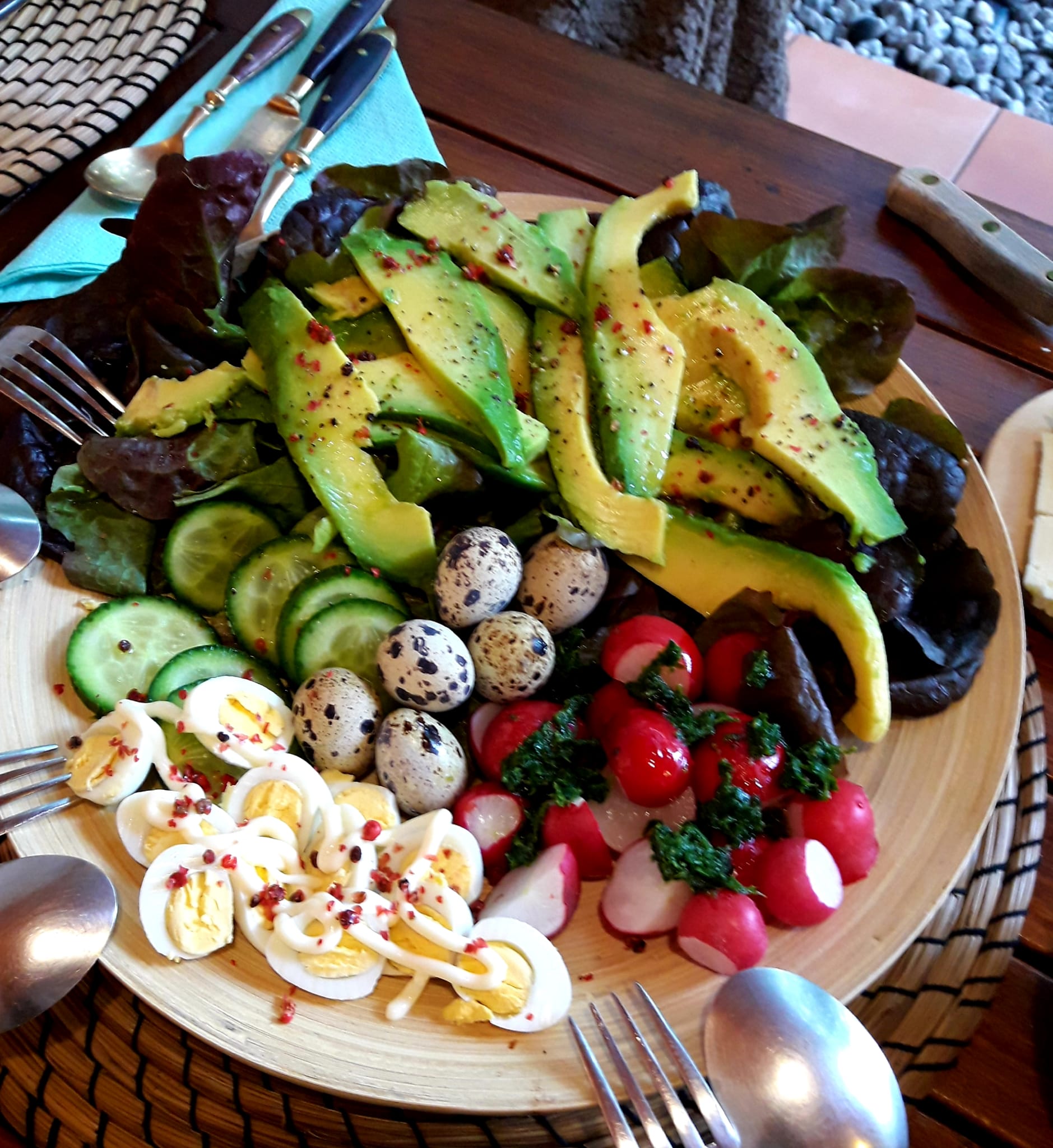 The central dish was ‘canasta’ lettuce which has a lovely colour ranging from green to deep purple and makes a perfect backdrop for whatever you want to put on top. I sliced an avocado quite thinly and squeezed lots of lemon juice over it to prevent it from discolouring, I also put sliced cucumber and radishes (I put some parsley pesto over the radishes) and quail eggs. As you’ll notice from the photo I got fed up shelling the quail eggs and put half of them on the plate intact….they’re so beautifully speckled and pretty! I halved the other ones and put some mayonnaise and crushed pink peppercorns on top. Then a drizzle of oil over everything salt and freshly ground black pepper and some more crushed pink peppercorns on the avocado.