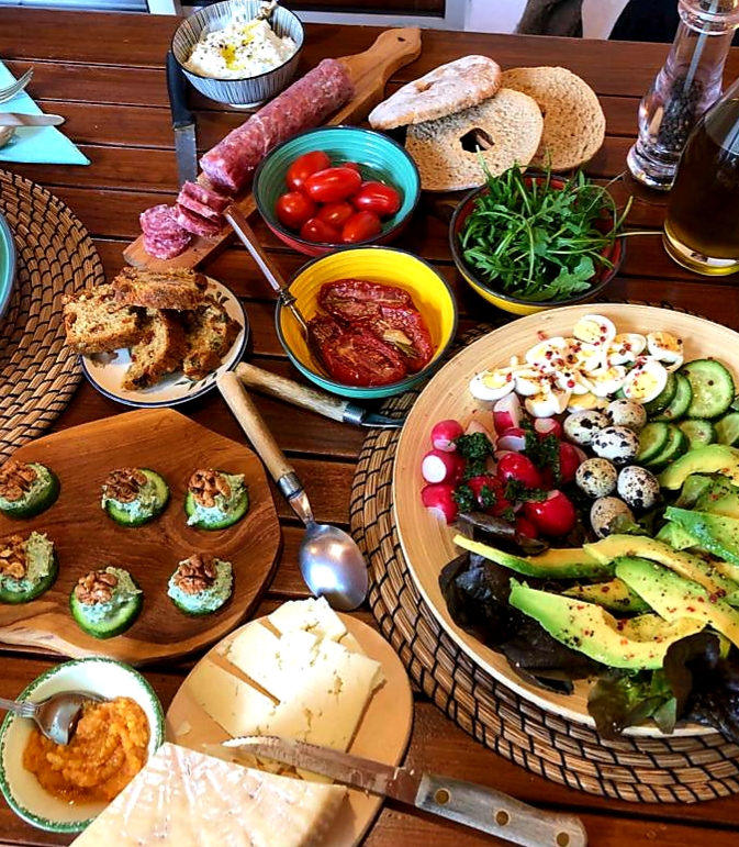 Mix 100 grams of cream cheese ( I used goat’s cheese) with a few leaves of cooked spinach…squeeze tightly to get rid of all the water. Zap with an immersion mixer. Put a spoonful onto thickish slices of cucumber…a walnut half on top. Buon appetito 🙂