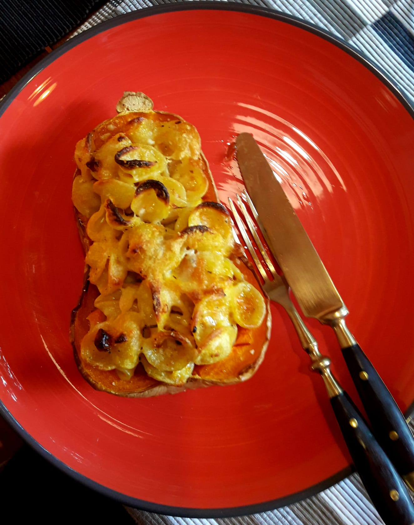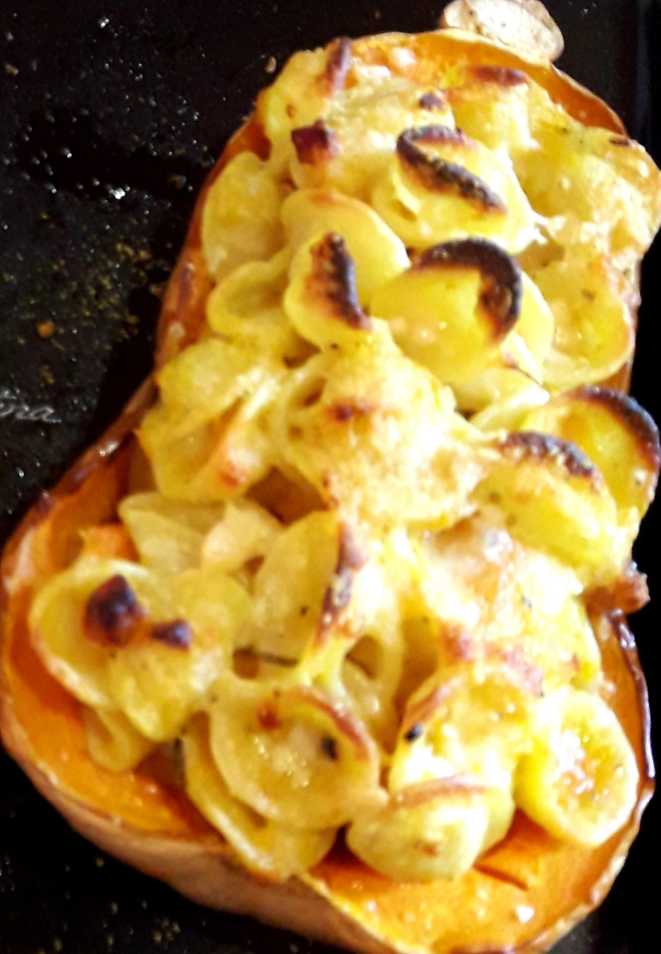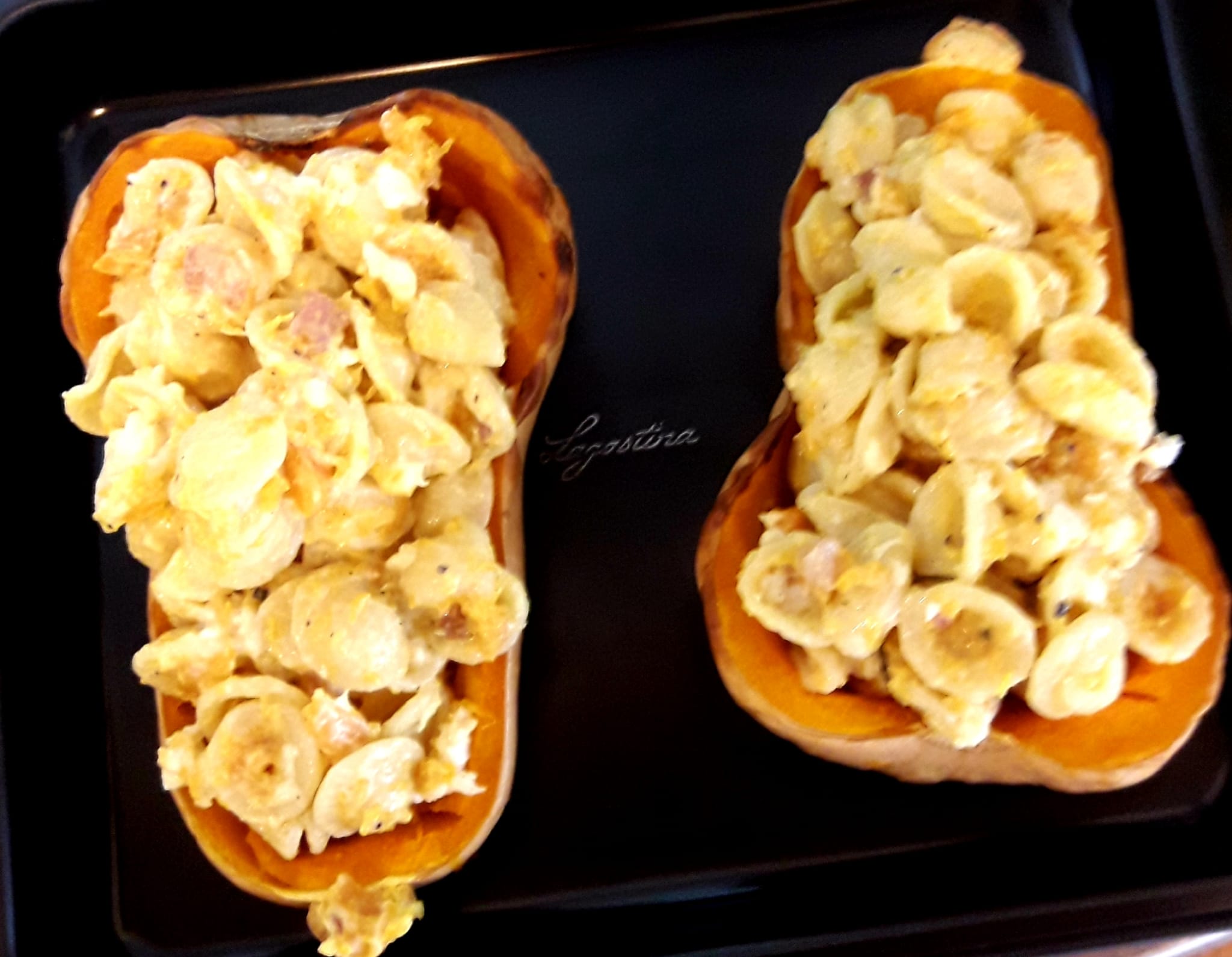 Spoon the pasta carefully into the cooked pumpkin shells, sprinkle with more grated cheese. Finish with a drizzle of extra virgin olive oil and bake at 200°C for about 20 minutes until it takes on a nice golden colour and the edges of the pasta begin to crisp. Buon appetito 🙂