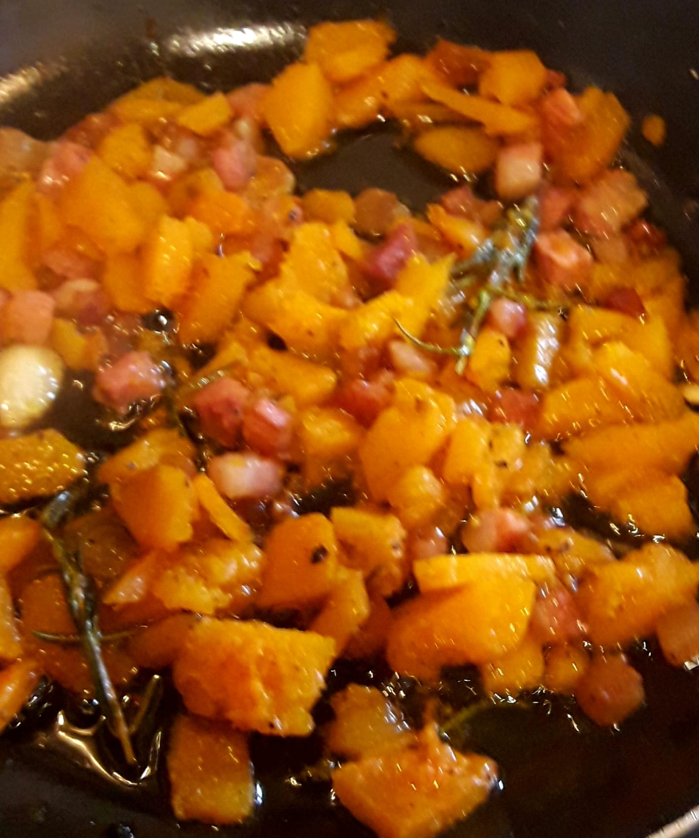 Halve the garlic clove and fry it gently in some extra virgin olive oil with the rosemary and guanciale or pancetta. When the guanciale pieces begin to get transparent and a bit crispy add in the chopped pumpkin and fry for a few minutes, then higher the flame, pour in the white wine and allow to evaporate. Lower the heat and cook, covered, until the pumpkin is soft…about 10 minutes. Salt and pepper to taste. In the meantime cook the pasta according to the instructions on the packet…you should strain it about a minute before the recommended time.