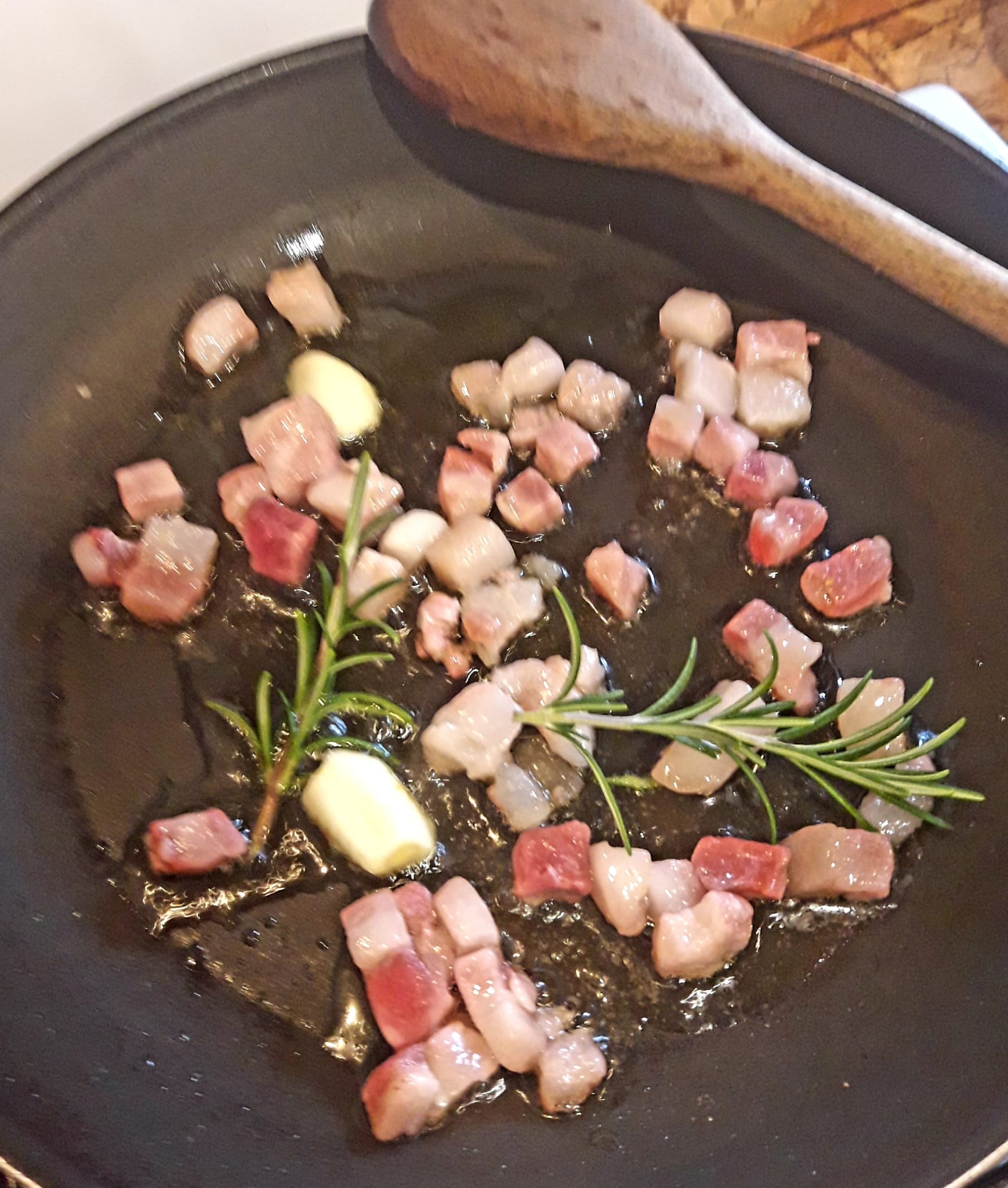 Fry the guanciale/pancetta with the garlic and a sprig of rosemary