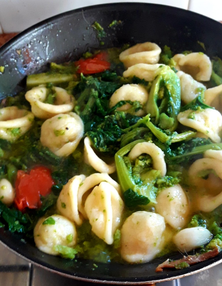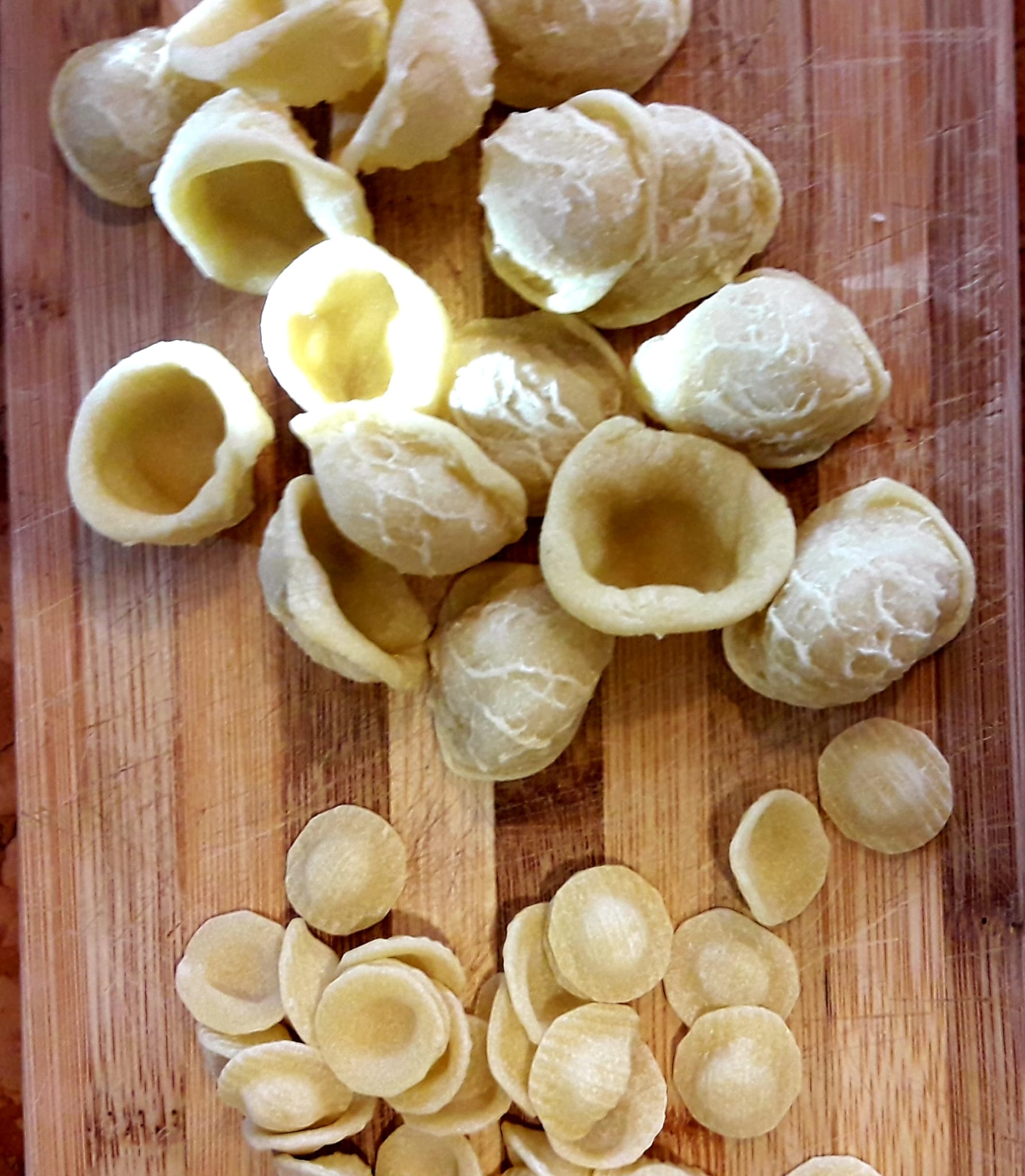 This medieval dish has been traditional in Bari since the 12th century when the city was under Norman-Swabian domination. The name ‘orecchiette’ means ‘little ears’ and it is so called because the shape of the pasta looks a bit like an ear. Orecchiette come in a variety of sizes, today I used the really big ones. You can buy them freshly made by the women in ‘Bari Vecchia’ -the old town, or you can use the dried orecchiette. The freshly made ones are, of course, the best, but the packet ones that you find in the supermarket are not at all bad.