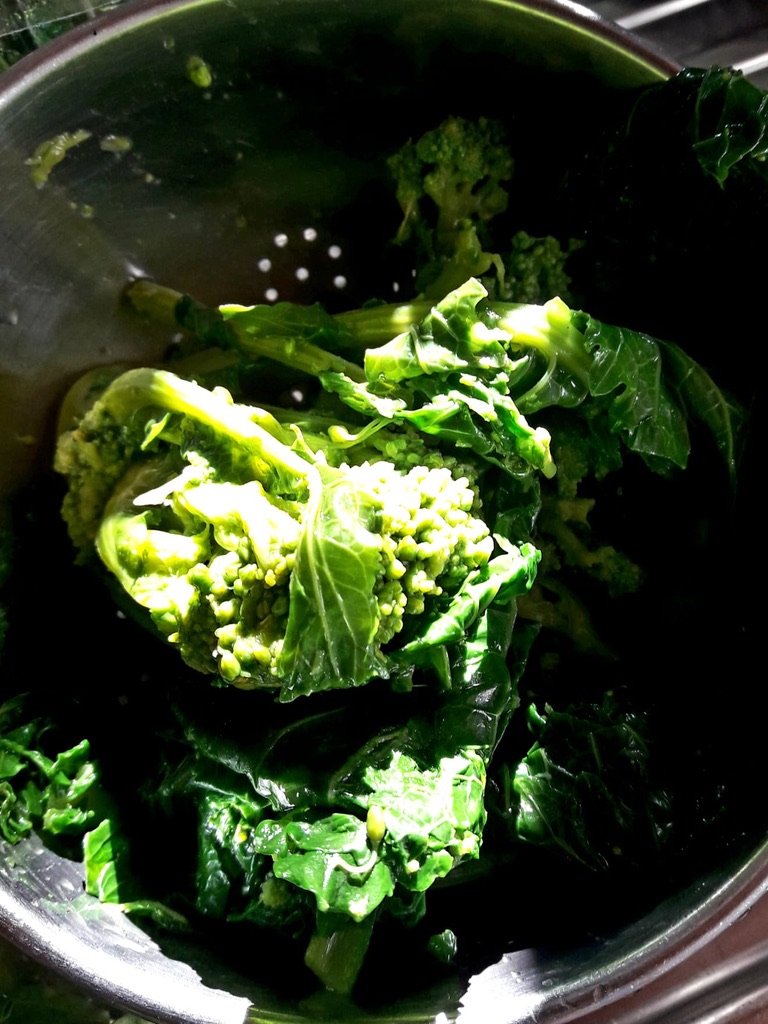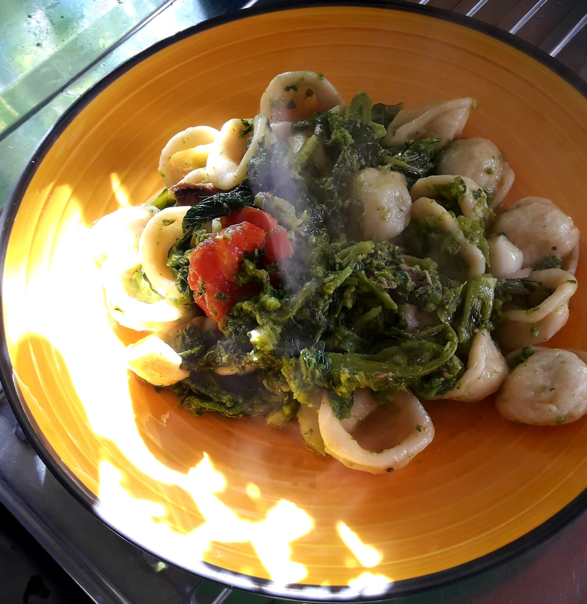 Boil the rape until just soft, strain and put aside. Meanwhile cook the pasta according to the instructions on the packet, or from the lady who made it if you’re fortunate enough to find it fresh 🙂 Put about 50mls of extra virgin olive oil in a pan with the garlic, halved tomato and anchovies (and chilli pepper if using). Fry gently for a few minutes until the tomato is soft and the anchovies begin to ‘melt’. Then add in the cooked rape, salt and freshly ground black pepper. Lower the heat and cover with a lid. Add in a drop of the pasta water if it looks a bit dry. Allow to cook for a few minutes until everything is amalgamated. Drain the pasta and add it to the rape, turn up the heat, pour in a good drizzle of olive oil and stir carefully with a wooden spoon for a minute or so. This is a very attractive dish with the vivid green of the rape and if you serve it on a brightly coloured plate it looks even better! Buon appetito!