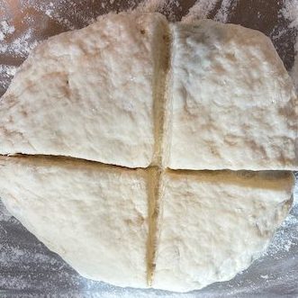 Sieve the dry ingredients. Pour in the buttermilk and mix with a wooden spoon. When the ingredients are more or less amalgamated you can knead the mixture to gather up any loose flour in the bowl. Add another drop of milk or water if it looks too dry. When all the flour has been incorporated turn the mixture onto a floured surface and knead for a few minutes until it becomes ‘elastic’. The put a dusting of flour onto a baking tray, shape the mixture into a round and cut a cross in the top. Bake at 190°/200° for 40 minutes until the bread has formed a nice crust and sounds hollow when tapped on the bottom.